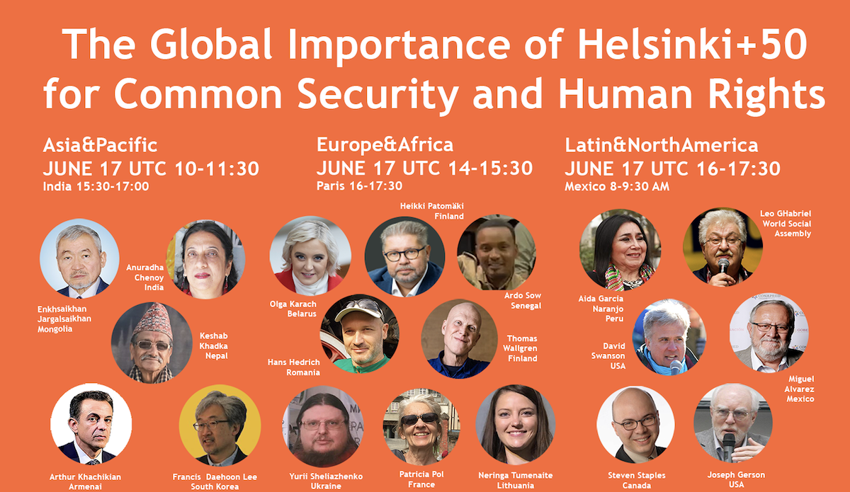 Three webinars – one for Asia & Pacific, a second for Europe & Africa, and a third for South & North America – took place on June 17. The idea was to underline the continuing importance of the “spirit of Helsinki” in spite of all the ongoing wars and rearmaments. The goal of the webinars, to reach out to all main popular movements and a broad range of regions world-wide as well as qualified expertise in the field was reached, writes Tord Björk, Coordinator of Nordic Peace Alliance Helsinki+50 working group, in the following report.