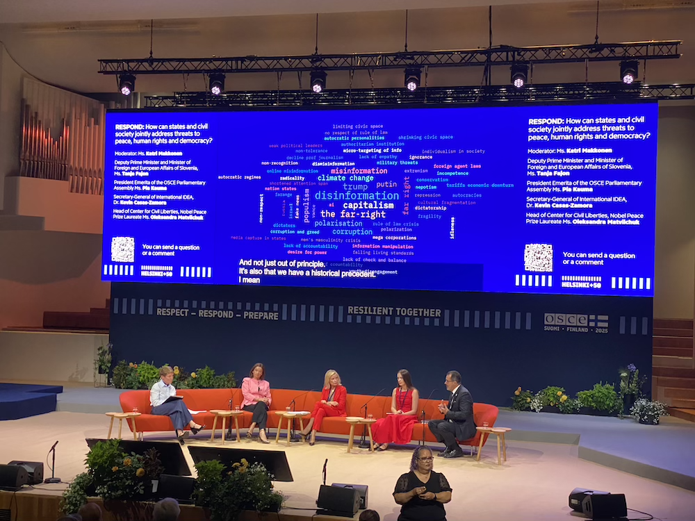 What can we learn from the past 50 years, and what are our ambitions for the next 50 years? These questions were posed in another official panel discussion. A young environmental and human rights activist, Helena Gualinga from Ecuador/Amazonas, who attended school in Finland, was allowed to speak. “Over the past two years, we have witnessed genocide—something that has not been discussed enough here today,” she said. “We all support Ukraine and can speak freely about it, but we are so afraid to mention Israel…” – here the audience applauded, but journalist Stephen Sackur, the panel’s moderator, interrupted her and reminded her that the OSCE states are not unanimous in calling the events in Gaza genocide. Gualinga replied: “It is precisely because we are unable to express ourselves clearly about these most horrific events that we are failing. What democratic values do we have then?” With this response, Gualinga drew further applause and seemed for a moment to cause the moderator to lose his composure.